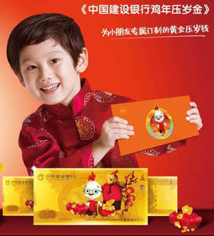 《中国建设银行鸡年压岁金》,真正为孩子专属打造的祈福压岁钱,具有传统的压祟祝福意义。连续发行12年,每年都选用最受孩子们喜爱的卡通形象,并且每一年都将一种情感融入压岁金中,真正具有情怀的压岁金。留住孩子最美好的12年的珍贵回忆。